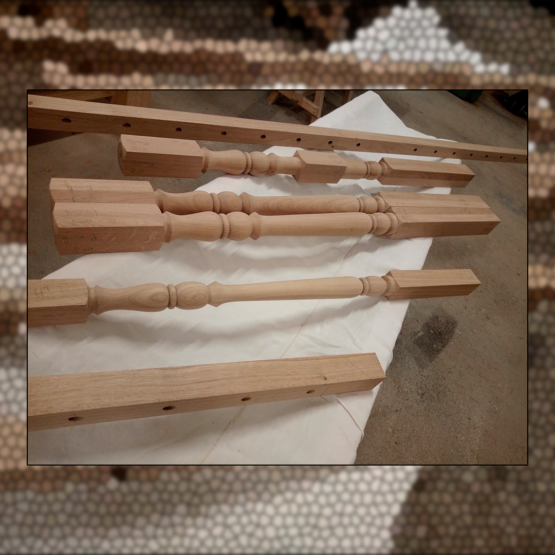 Balustres en fer forgé avec mains courantes et poteaux tournés en chêne.